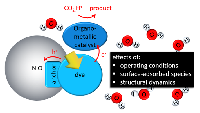 Dye-sensitized photocathodes attract wide interest because of their ease of fabrication and tunability in properties for light-driven proton or CO2 reduction. They are often based on nanocrystalline NiO, functionalized with a photosensitizer and catalyst, immersed into an aqueous electrolyte optionally saturated with CO2. Developing fundamental insight into their photo- and structural dynamics, especially as a function of the nanostructure and process conditions to which the photocathode is exposed, is essential to realize efficient design approaches.