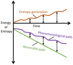 Figure 1. Illustration of the Phenomenological Entropy Generation (PEG) theorem, showing the ideal zero-aging path (green line) and the aging path (purple curve). Aging/degradation (orange curve) is, therefore, the vertical difference between the paths (see black arrows).