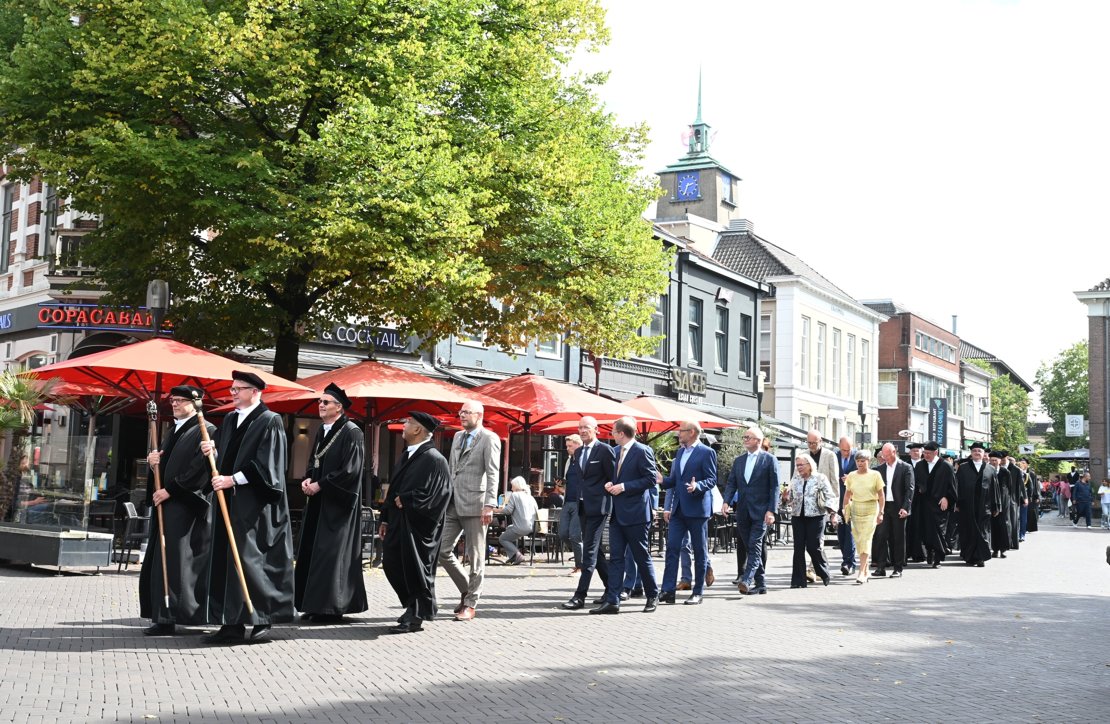 The day began with a procession of professors and lecturers, dressed in academic gowns, walking from the town hall to the Wilminktheater. The centuries-old academic tradition was thus made visible in the heart of the city. During the ceremony, culture also had a place, with a creative rendition of Willem Wilmink’s poem Textielstad, connecting Enschede’s industrial past to the resilience and innovative strength of the present.