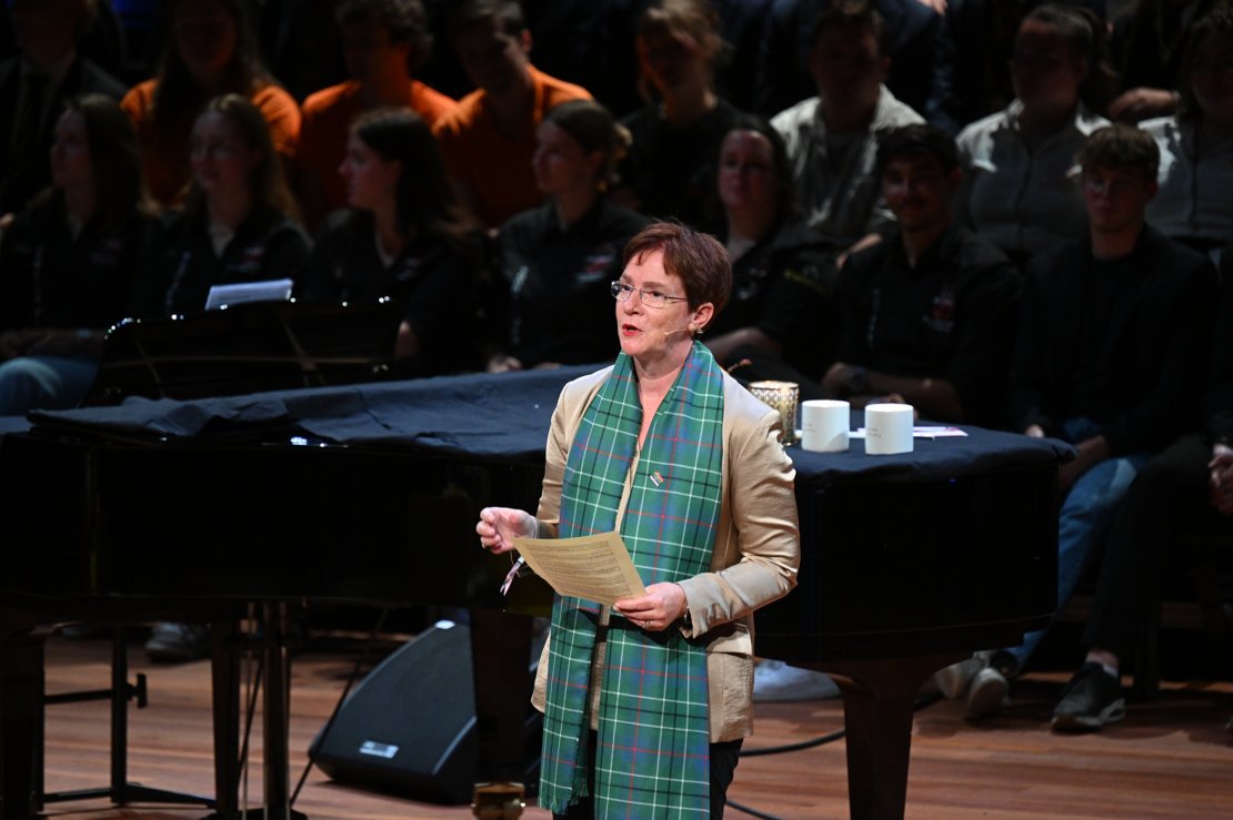 Saxion president Inge Grimm opened her speech with a striking symbol: a scarf designed by textile designer and researcher Hellen van Rees, affiliated with the Saxion research group Sustainable and Functional Textiles. The red thread in the scarf referred both to Enschede’s textile heritage and to the power of collaboration and knowledge sharing in the region. Grimm described Saxion as a “knowledge accelerator,” with more than 25,000 students and 3,000 staff, positioned at the heart of society and speeding up innovation through applied research. At the same time, she pointed to the heavy pressure of government cuts and argued for a funding system not based solely on student numbers but on the societal importance of programs. “Only through collaboration can progress be made. Our students are the makers of the future,” she stressed, citing many examples of Saxion students contributing to city and region.