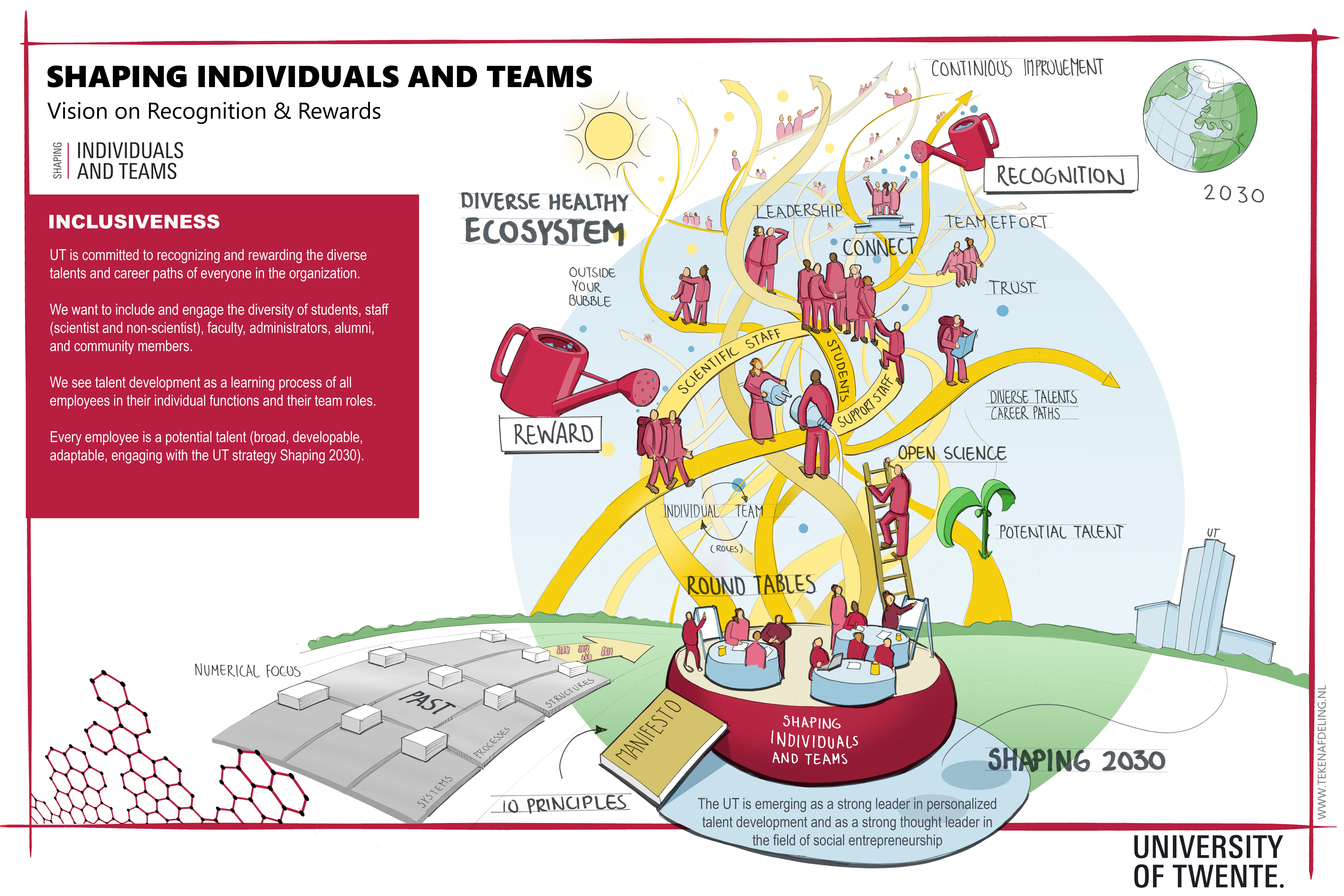 What steps do we need to take to be the university where everyone feels recognized and rewarded? What is the unique UT-way of working for staff and students that connect us all and give us wings to soar, that makes us proud to be part of the People-First University of Technology? Our dream is to recognise everybody's talent and stimulates personal talent development, to connect us, to distinguish ourselves as individuals, and color our roles in teams, and to enable continuous improvement across all fields of work.