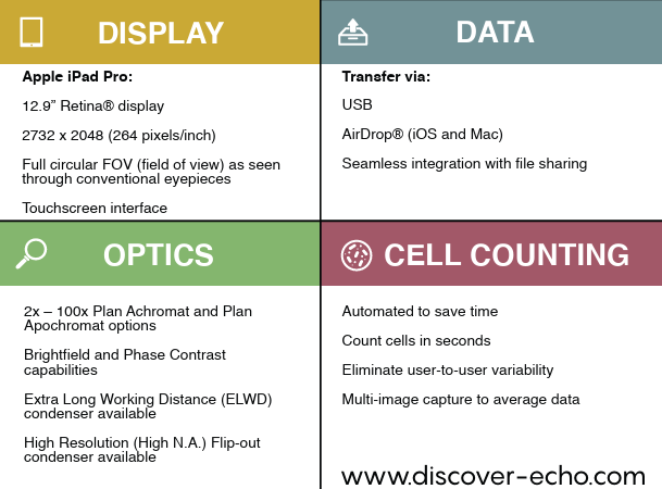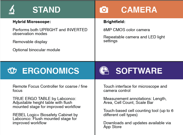 Imaging your cells inside a laminar flowhood has never been more easy, with the Echo Rebel. Simply rotate the microscope to use it as an inverted or upright microscope for well plates, microscope slides or other cell/tissue holders.