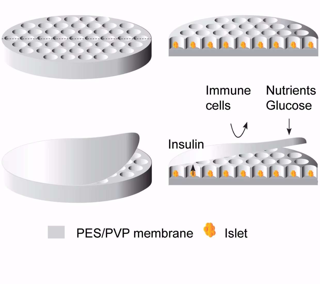 The (bio)artificial organs chair of Professor Dimitrios Stamatialis focuses on the development of novel immune-protective membrane-based cell encapsulation devices, containing insulin producing cells for regulation of blood glucose in T1D, without the need for injections and immunosuppressive drugs. The pancreatic islets are seeded in separate microwells to avoid aggregation, whereas the membrane porosity is tailored to achieve sufficient transport of nutrients, glucose and insulin (Figure 1).