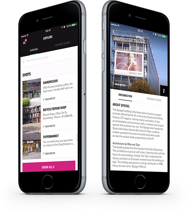 L'app Campus ti guiderà alla tua riunione, al parcheggio più vicino al tuo appuntamento o a qualsiasi altro punto di interesse all'aperto. Come studente dell'Università di Twente, l'app ti mostra anche il tuo orario. Non hai ancora una riunione nel campus? Non preoccuparti, l'app del campus ti consente di esplorare il campus, visualizzare e partecipare a eventi imminenti o pubblicare sulla bacheca. Se sei già qui, puoi anche vedere cosa sta succedendo vicino a te in questo momento!