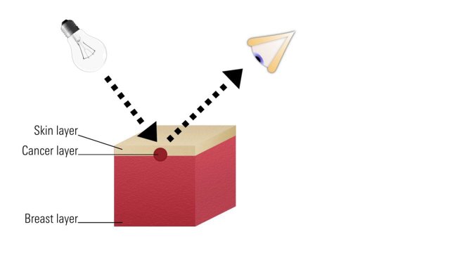 Wetenschappers van de Universiteit Twente, die zich bezighouden met de optische eigenschappen van menselijk weefsel, wilden weten of het mogelijk was dat een borsttumor inderdaad verantwoordelijk was voor de verkleuring van de borst. Ze simuleerden miljoenen fotonen (“lichtdeeltjes”) met verschillende golflengtes die op een borst met daarin een tumor werden afgevuurd. Vervolgens keken ze hoeveel fotonen er weer terugkwamen en als welke kleur het menselijk brein het terugkerende licht zou interpreteren.