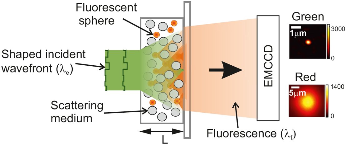 De experimentele set-up: fluorescerende deeltjes in de verstrooiende laag registreren hoeveel lichtenergie ter plekke aanwezig is. Het invallende licht zorgt dankzij 'wavefront shaping' voor een betere energieverdeling.
