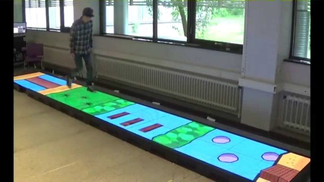 De videovloer op de UT is modulair en heeft een oppervlakte van zo’n 9 vierkante meter. De therapeut bepaalt met een tablet hoe de therapiegame eruit ziet. Er zijn veel verschillende games mogelijk, zoals een doorlopend pad waarop bladeren verschijnen. De patiënt moet hierop stappen en wordt bij het missen van zo’n blad ‘opgegeten’ door een haai. “Die games zijn vaak competitief”, vertelt Reidsma. “Dat maakt het leuker. We gaan de vloer ook voor ander onderzoek inzetten. Zo kunnen we kindergames weergeven, of een ‘smart home’ met meubelen en apparatuur.”