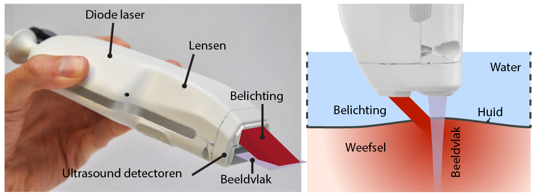 Wetenschappers van onderzoeksinstituut MIRA ontwikkelden enige tijd geleden, samen met diverse bedrijven, een prototype van een handzaam apparaat dat echoscopie met fotoakoestiek combineert.