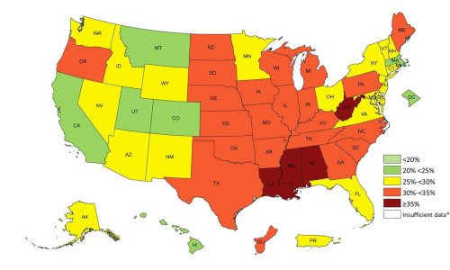 Percentages volwassenen met obesitas in de VS, 2015 (Centers for Disease Control and Prevention)