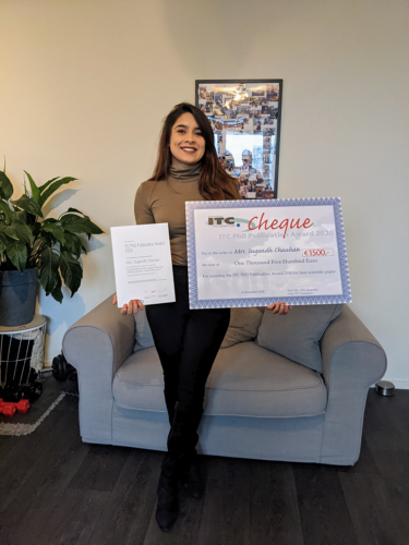 ITC overhandigde haar de prijs voor haar uitstekende wetenschappelijke publicatie over de remote sensing van verbogen gewassen. Eerder dit jaar verdedigde ze haar promotieonderzoek cum laude. Bij de prijs die Sugandh ontvangt gaat hoort een cheque van €1500. "Ik ben zeer vereerd om deze prijs te ontvangen. Ik dank de ITC-faculteit en mijn begeleiders Andy, Roshanak en Mirco voor hun bijdrage aan dit succes. Eerlijk gezegd is dit jaar voor mij in alle opzichten het beste geweest: mijn doctoraat binnen 4 jaar succesvol en Cum Laude afronden, een baan krijgen en de als kers op de taart de ITC PhD Publication Award 2020".