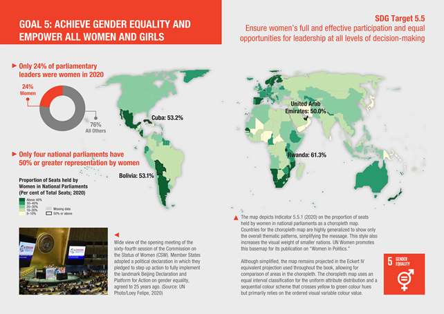 De evaluatie van onze kaarten is net zo kritisch als de ontwikkeling ervan. De bruikbaarheid van een kaart is van cruciaal belang voor de algehele gebruikerservaring, oftewel het proces dat leidt tot een succesvol en bevredigend resultaat. "In ons VISUSE-lab passen we een robuust, gebruikersgericht ontwerpproces toe waarbij we vroeg en vaak feedback vragen van het beoogde publiek", zegt Kraak. Figuur 4 toont een kaartontwerp van SDG-indicator 5.5.1 voor het algemeen geïnteresseerde publiek. De kaart gaat vergezeld van foto's en een verklarende tekst die de context van de indicator schetst en het kaartontwerp rechtvaardigt.