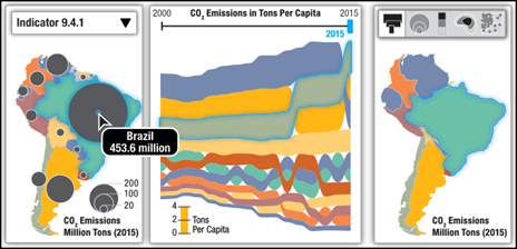 Figuur 3 is een ander voorbeeld van het werk van Kraak. Het toont een interactief dashboard dat een visuele samenvatting geeft van gegevens van SDG indicator 9.4.1 over CO2-uitstoot. Het bevat een proportionele symboolkaart, een stroomgrafiek, en een cartogram, die meerdere perspectieven op de indicator ondersteunen. Gecoördineerde interactie tussen deze meerdere weergaven is essentieel om open-ended exploratie en diepgaande analyse te ondersteunen en maakt het mogelijk om voorheen onbekende inzichten in patronen, trends en anomalieën in een reeks datasets te onthullen.
