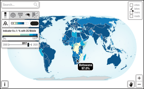 Hoewel het boek een generieke visie op cartografie biedt, raakt het direct aan het onderzoekswerk van cartografen en datavisualisten aan de faculteit ITC. Wij concentreren ons op het ontwikkelen en evalueren van online alternatieve grafische representaties die veranderingen in de tijd kunnen weergeven. "Dat doen we in interactieve online omgevingen, die de gebruiker verschillende mogelijkheden bieden om met de kaart te 'spelen'", legt Kraak uit. Bijvoorbeeld in de kaarten in figuur 2. Die kaart geeft SDG indicator 9.c.1 weer; het deel van de bevolking dat beschikt over een 2G mobiel netwerk. De gebruiker kan het type kaart, de classificatie en het jaartal wijzigen.