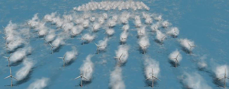 Een 3D-visualisatie van een simulatie van de interactie tussen twee windparken. De witte wolken achter de windturbines geven de gebieden aan met lage windsnelheid, de zogenaamde windturbine-zoggen.