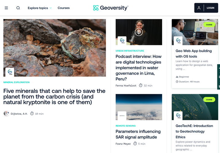 Geoversity is gelanceerd door ITC en de Universiteit Twente, om het go-to platform te worden voor mensen en organisaties die op de hoogte willen blijven van de laatste inzichten, kennis en technologische ontwikkelingen in het geospatiale domein.