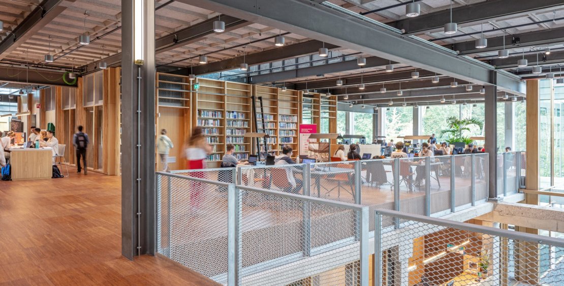De Faculteit ITC, ontworpen door Civic Architects & VDNDP, Studio Groen+Schild en DS Landschapsarchitecten, bevindt zich in een voormalig laboratorium op de campus van de TU Twente. Het gebouw, oorspronkelijk brutalistisch, is getransformeerd tot een open en licht ‘leerlandschap’. Vier atria, gevuld met bomen, planten en een waterpartij, brengen licht en lucht in het gebouw. Nieuwe eikenhouten wanden en bamboevloeren geven het interieur warmte.