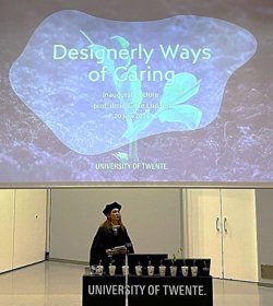 In haar oratie ging Geke Ludden dieper in op de vraag hoe expertise en interaction design kunnen helpen om maatschappelijke problemen op het gebied van gezondheid en zorg op te lossen. Ze introduceerde drie zogeheten 'designerly ways of caring' (mensgerichte ontwerpmethodes voor de zorg) om te illustreren hoe interaction design op elk niveau (micro, meso en macro) in ons zorgstelsel een bijdrage kan leveren. Prof. Ludden benadrukte dat het ontwerpen van oplossingen voor een duurzaam zorgsysteem alleen mogelijk is als we goed kijken hoe mensen, andere levende wezens en onze natuurlijke omgeving met elkaar verbonden zijn.