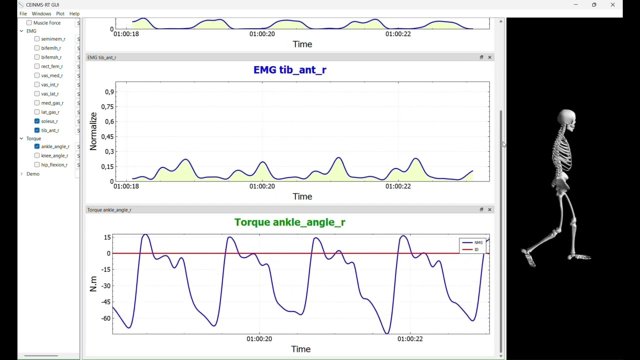 CEINMS-RT grafische gebruikersinterface: De figuren tonen EMG-signalen van de tibialis anterior spieren (tib_ant_r) die worden gebruikt om een spier-skelet model aan te sturen (d.w.z. de skelet avatar op het rechtervenster), waarmee vervolgens biologische enkelmomenten (onderste grafiek) in realtime geschat worden. Geschatte biologische momenten worden gebruikt om bionische ledematen en exoskeletten te besturen.